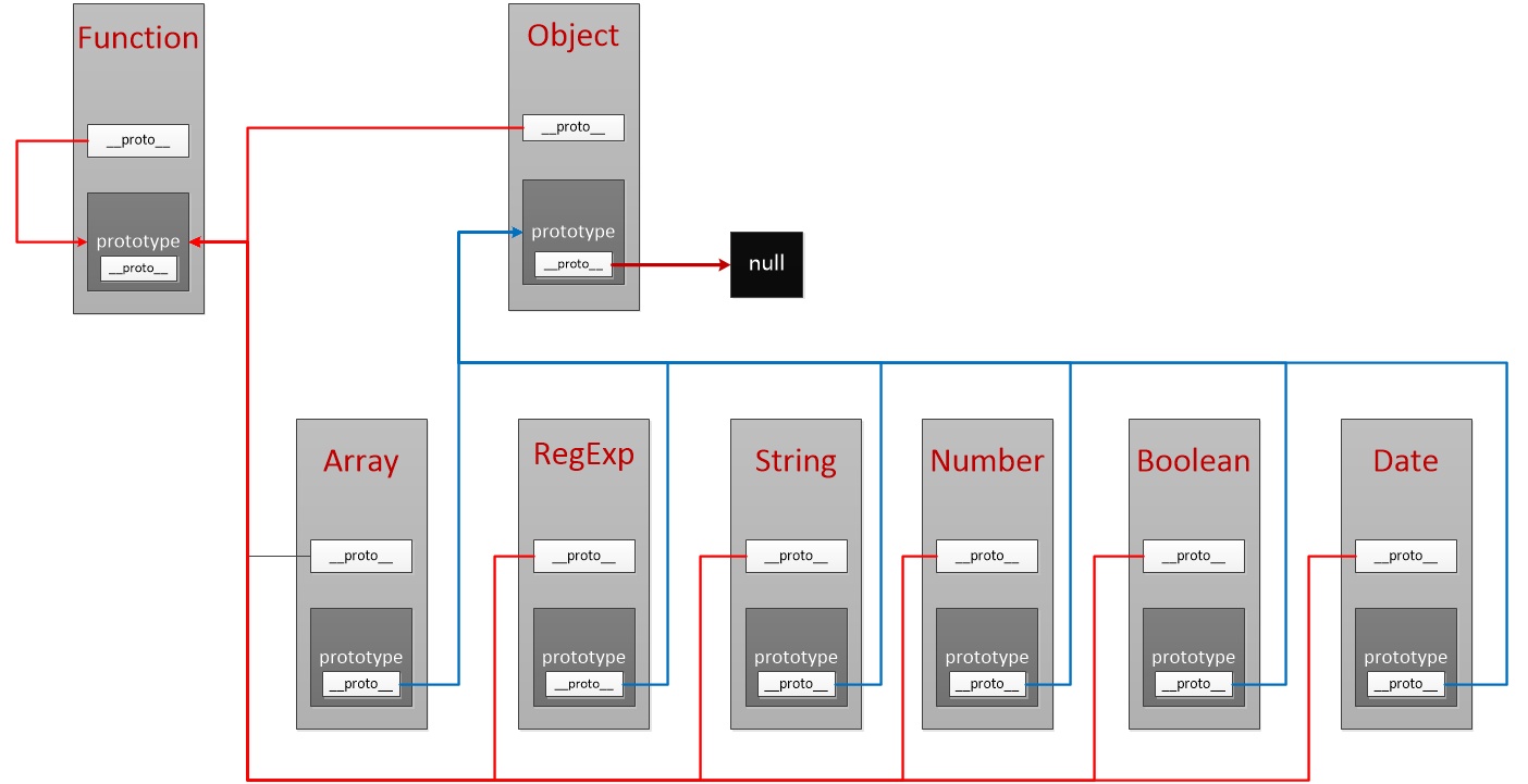 - 除了 Oject 的原型对象的 __proto** 指向 null,其他所有内置函数对象的原型对象的 __proto** 都指向 object。
