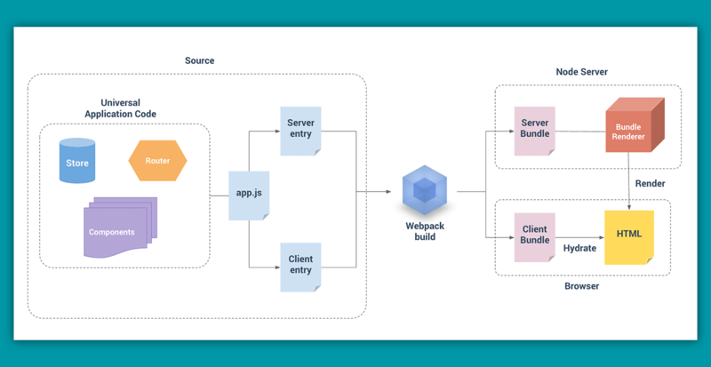 流程图大致意思是:将 Source(源码)通过 webpack 打包出两个 bundle,其中一个 Server Bundle 是给服务端用的,服务端通过渲染器 bundleRenderer 将 bundle 生成 html 给浏览器用;另一个 Client Bundle 是给浏览器用的,别忘了服务端只是生成前期首屏页面所需的 html,后期的交互和数据处理还是需要能支持浏览器脚本的 Client bundle 来完成。